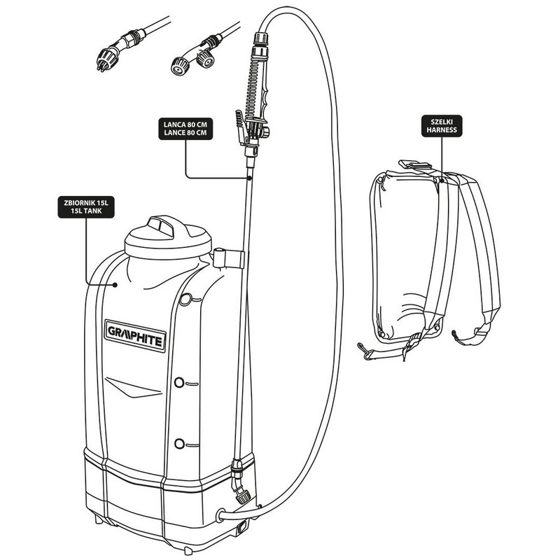 Opryskiwacz akumulatorowy Energy+ 18 V 58GE106 marki GRAPHITE to praktyczne urządzenie do stosowania przy domu oraz w ogrodzie. Wyposażone jest w zbiornik o pojemności 15 litrów. Obsługuje przepływ wody ?1.3L/min (z podwójną dyszą natryskową). Maksymalne ciśnienie to 3 bar. Spray otworu dyszy wynosi 1,6 mm, a długość słupa sprayu – 800 mm. Opryskiwacz GRAPHITE wyposażony jest w praktyczny pas na ramię. W zestawie oferowany z 3 dyszami rozpylającymi, poszerzającymi zakres możliwości urządzenia. Wybierając opryskiwacz akumulatorowy Energy+, otrzymuje się swobodę korzystania z narzędzia. Polecana bateria o pojemności 2 Ah jest w stanie opróżnić 9 zbiorników po 15 litrów każdy.