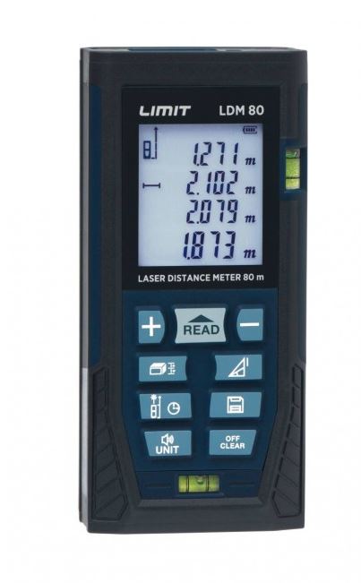 Limit LDM 80 to solidny, kompaktowy dalmierz laserowy przeznaczony do profesjonalnego użytku również w trudnych warunkach. Mierzy dystans do 80 metrów i jest łatwo przenośny w torbie lub kieszeni. Szybki czas reakcji. Wysoka dokładność ± 2 mm. Podświetlany wyświetlacz. Samokalibrujący. Prosty pomiar odległości punkt-punkt, pomiar pola powierzchni i objętości, pomiar z opóźnieniem czasowym, funkcja tyczenia, pomiar z wykorzystaniem twierdzenia Pitagorasa, funkcja pomiaru ciągłego (śledzenie). Pomiary z dodawaniem i odejmowaniem, oraz funkcja zapisu. Wybór punktu odniesienia: przednia krawędź, środek przyrządu lub odkładany element tylny. Przełączanie jednostek: metry, stopy i cale. Automatyczne wyłączanie. Dostarczany z futerałem i paskiem na nadgarstek. Baterie w załączeniu.