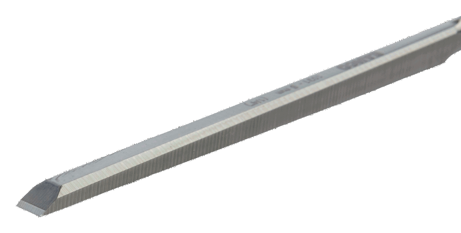 - Dłuta i żłobiki mają trapezowy kształt na całej długości co oznacza, że części boczne są zukosowane do około połowy szerokości ostrza