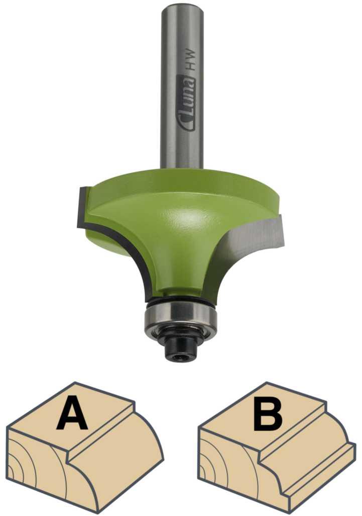Frezy zaokrąglające z ostrzami z węglików spiekanych i kulkowym łożyskiem prowadzącym wg rys. A. Frez może pracować z mniejszym łożyskiem dla uzyskania profilu B, patrz tabela z łożyskami alternatywnymi.