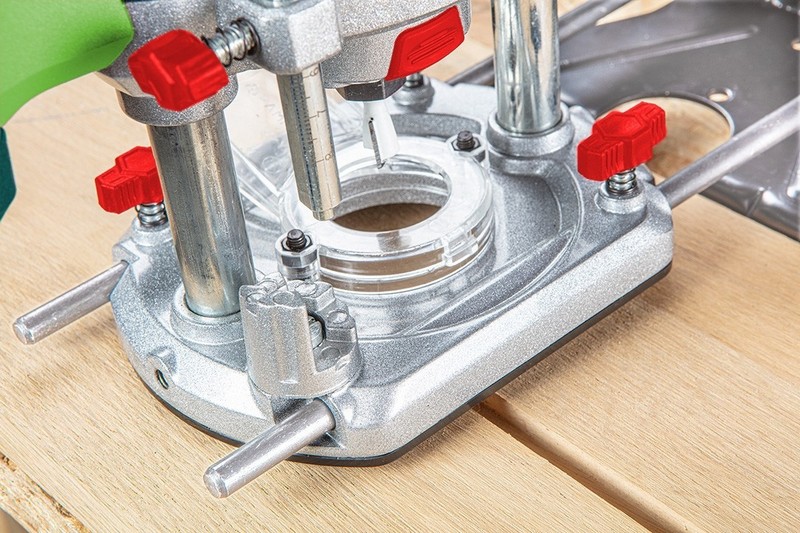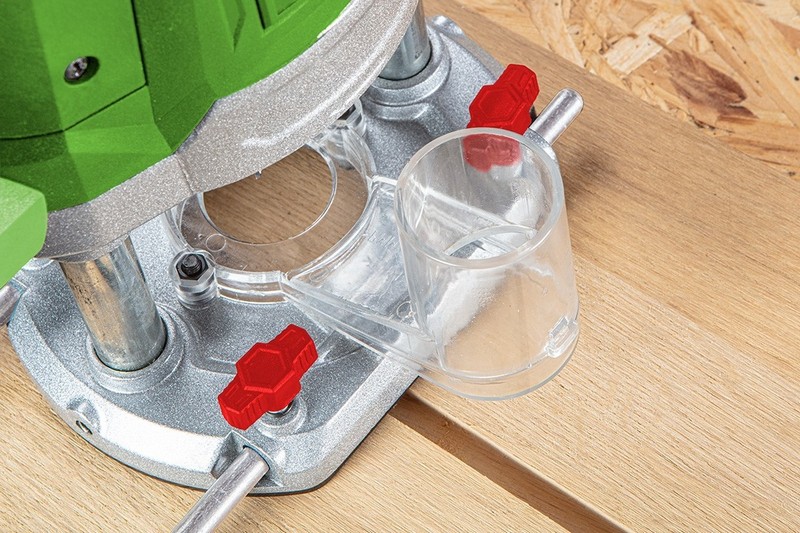 Zakres prędkości obrotowej na biegu jałowym wynosi od 11500 do 34000 min-1. Urządzenie wyposażono w stabilną aluminiową stopę, zapewniającą łatwe prowadzenie urządzenia po wszelkiego rodzaju powierzchniach. Ergonomiczne rękojeści frezarki zostały pokryte antypoślizgowym materiałem, dzięki czemu operowanie urządzeniem jest komfortowe i bezpieczne. Osłona przeciwpyłowa oraz adapter do odciągu pyłu wykonane zostały z przezroczystego poliwęglanu. W zestawie z frezarką znajdują się: klucz płaski, tuleja prowadząca, szpikulec do frezowania po okręgu, adapter do odsysania pyłu, tuleję zaciskową, aluminiowa prowadnica równoległa wyposażona w specjalną nakładkę, chroniącą przed zarysowaniami oraz mechanizm umożliwiający precyzyjną regulację położenia frezu względem krawędzi materiału.