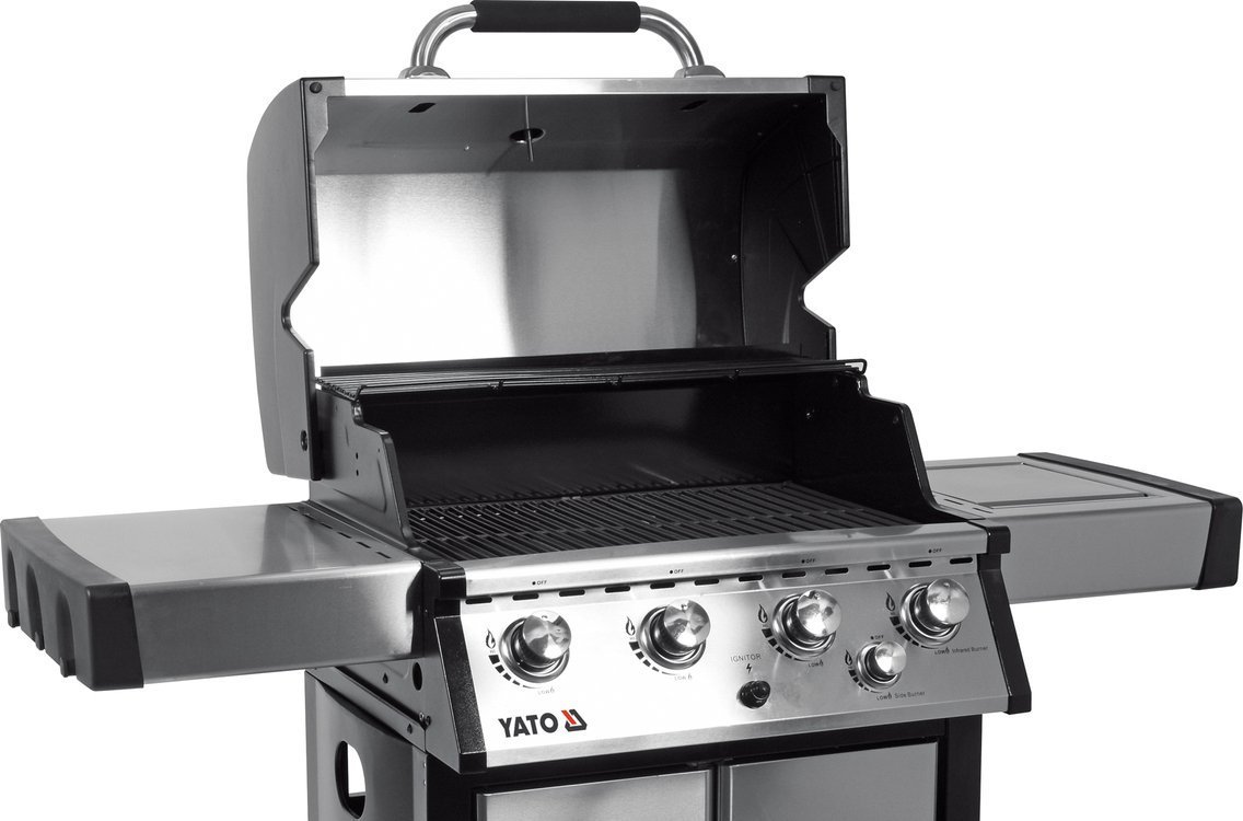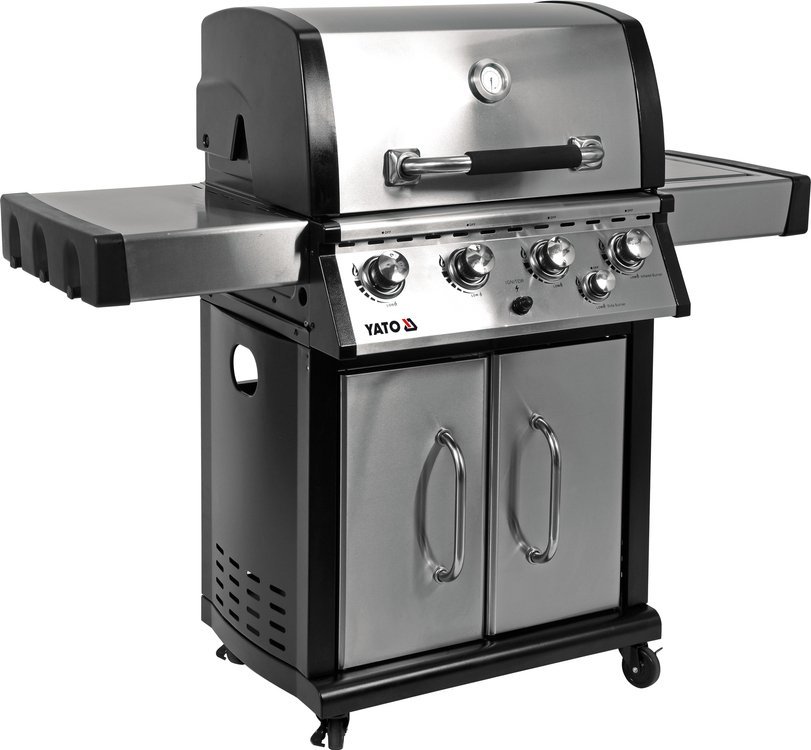 Ekskluzywny, największy w kolekcji YATO grill gazowy 4+1 wykonany ze stali nierdzewnej, wyposażony w masywny, żeliwny ruszt. Półki boczne z wieszakami oraz pojemna, zamykana szafka ułatwią przechowywanie przypraw i niezbędnych akcesoriów. Palnik boczny o mocy 3,5kW umożliwi gotowanie i podgrzewanie potraw w garnku i na patelni