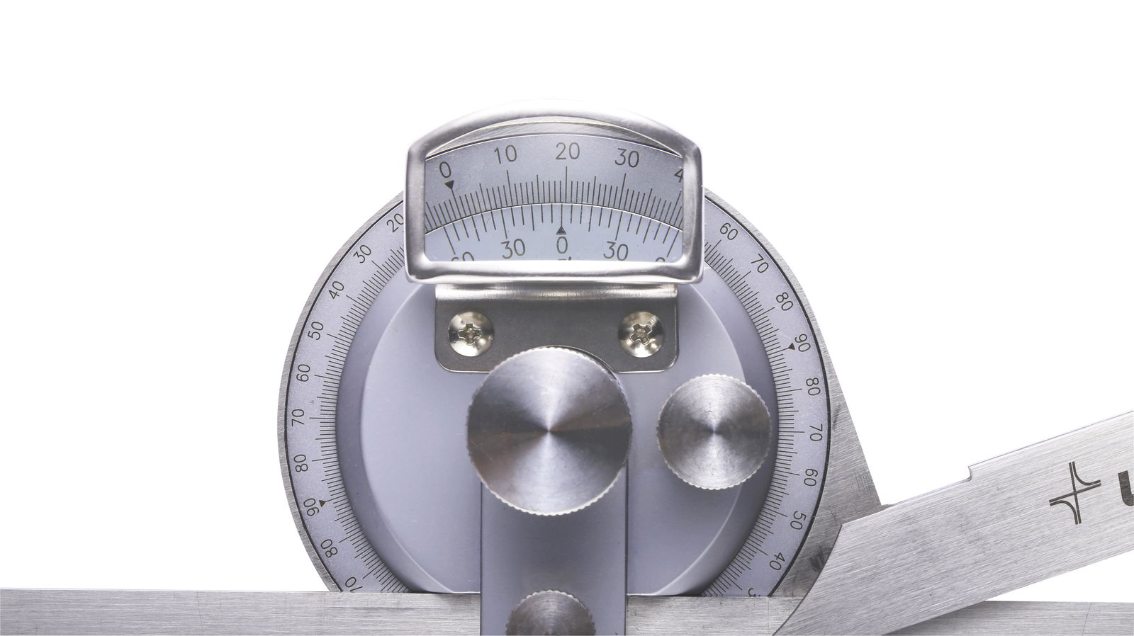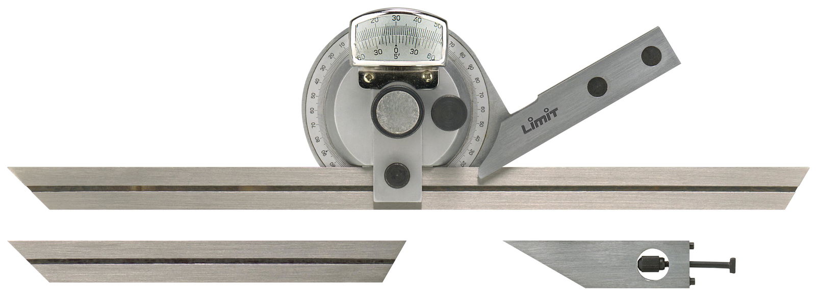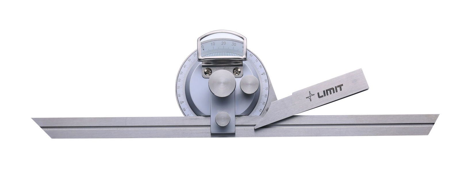 Ze stali nierdzewnej. Tarcza ma na obwodzie naniesione podziałki 0-90° biegnące w obu kierunkach, i można ją ustawiać pod dowolnym kątem względem ramienia odniesienia. Wyposażony w szkło powiększające dla ułatwienia odczytu. Z noniuszem o rozdzielczości 1/12° = 5 minut. Ramiona mogą być przesuwane, a następnie blokowane za pomocą śruby zaciskowej. Dostarczany z dwoma wymiennymi ramionami.