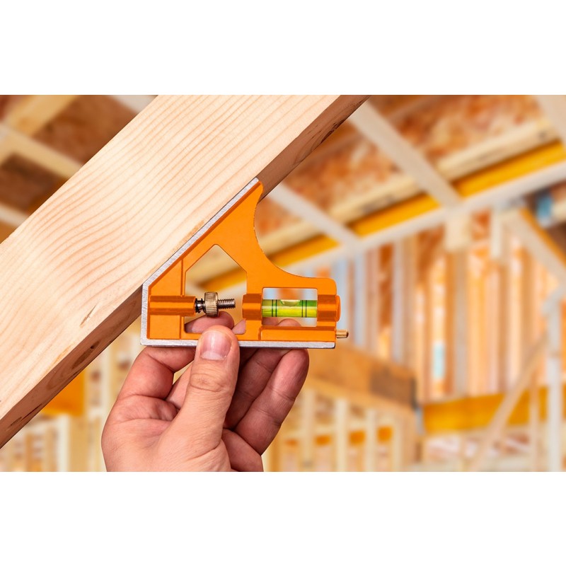 Może pełnić wiele funkcji: kątownik, liniał, przymiar, głębokościomierz, poziomnica.