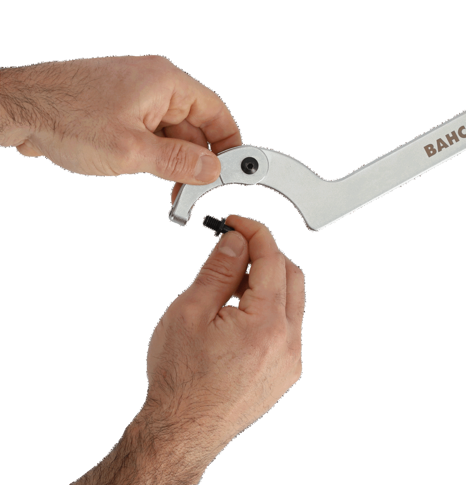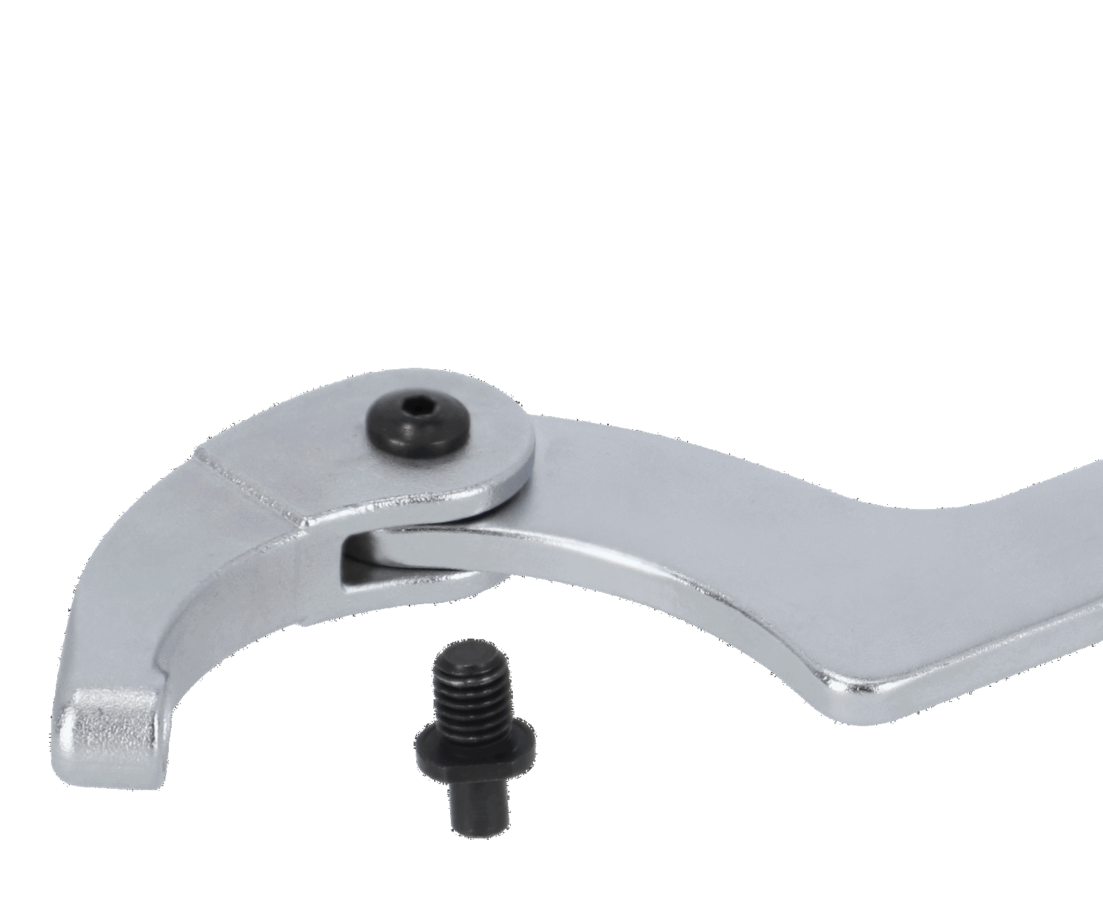 - Klucz hakowy z okrągłym bolcem, przegubowy (regulowany). Zastosowanie przegubu zwiększa znacznie zakres stosowania. Do serwisu kołnierzy, pierścieni, łożysk. Pojedyncza, ruchoma szczęka na sworzniu.