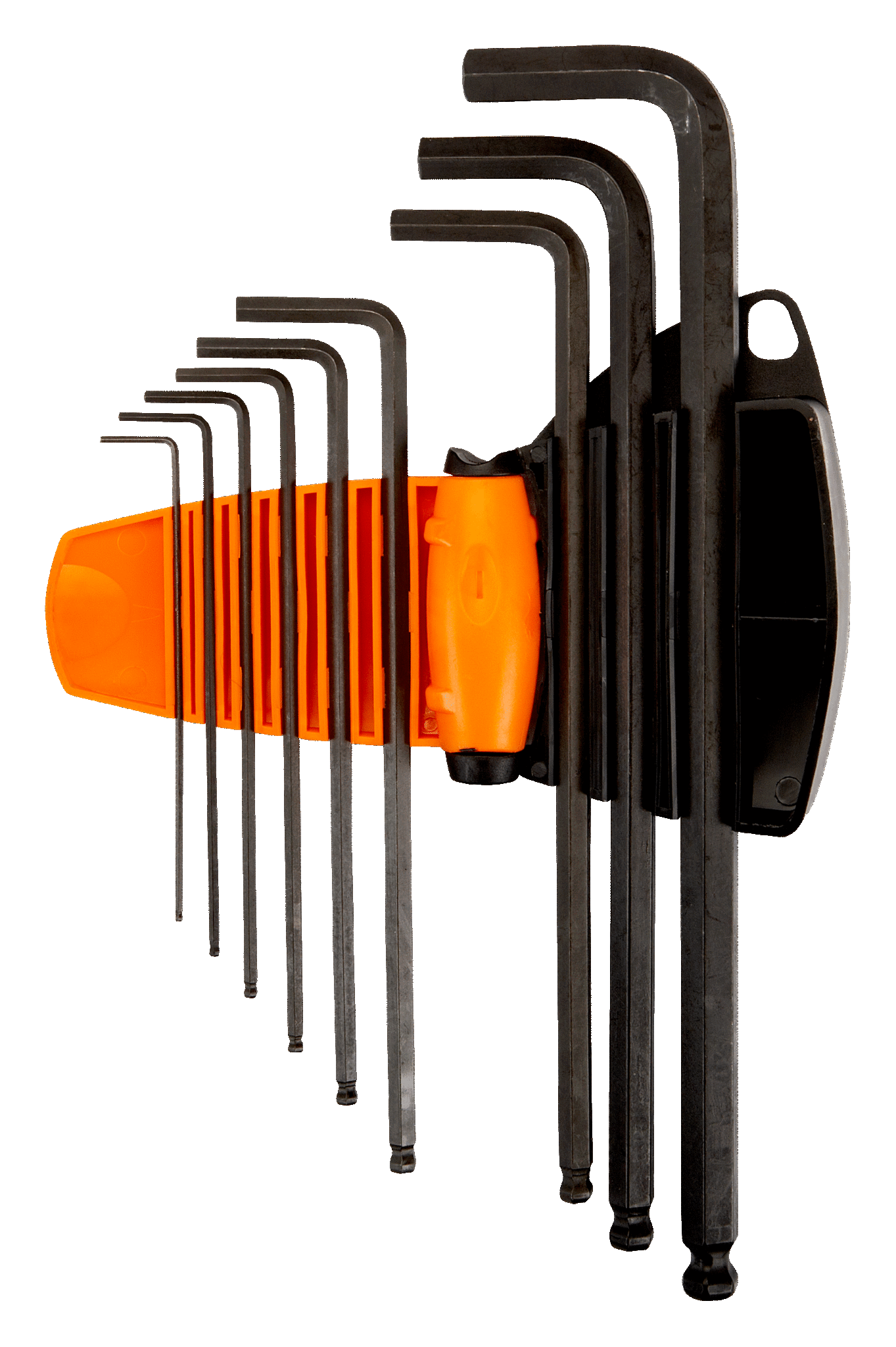- Zestaw czernionych długich kluczy trzpieniowych z kulką, do śrub imbusowych, metrycznych, 9 sztuk