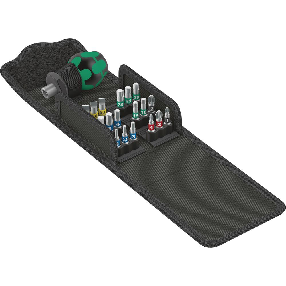 Zawartość zestawu: 1 rękojeść z uchwytem do bitów Stubby 3 bity do śrub z rowkiem prostym 5,5 x 0,8; 5,5 x 1,0; 6,5 x 1,2 mm 2 bity do śrub z gniazdem krzyżowym PH 1; 2 2 bity do śrub z gniazdem krzyżowym PZ 1; 2 6 bitów do śrub z gniazdem 6-kątnym 2; 2,5; 3; 4; 5; 5,5 mm 5 bitów do śrub z gniazdem TORX® T 10; 15; 20; 25; 30