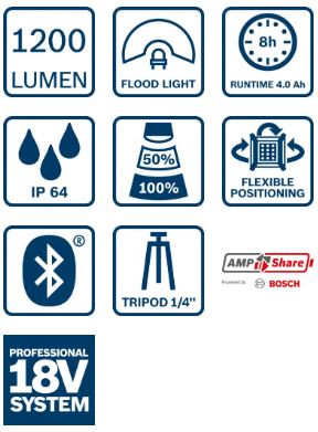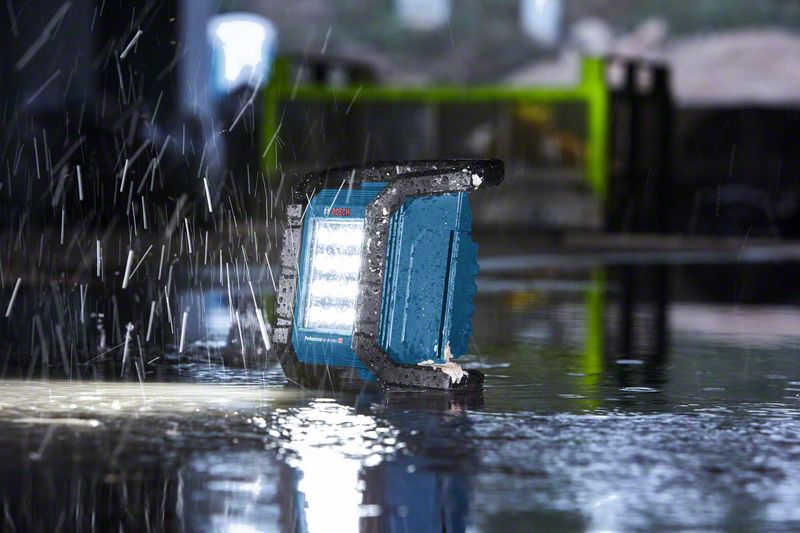 GLI 18V-1200 C Professional to kompaktowa i wytrzymała lampa robocza Bosch w klasie napięcia 18 V. 12 wydajnych diod LED zapewnia strumień świetlny do 1 200 lumenów, a tym samym doskonałe oświetlenie. Lampa robocza jest pyło- i bryzgoszczelna dzięki solidnej osłonie akumulatora (stopień ochrony IP 64). Wygodna obsługa za pomocą smartfona pozwala na szybką i łatwą regulację oświetlenia. Narzędzie posiada dwa ustawienia jasności, pięć ustawień kąta oraz gwint do statywu 1/4″ pozwalający szybko dostosować się do każdej sytuacji podczas pracy. Lampa doskonale oświetla kompletny obszar pracy przez cały dzień. Produkt jest kompatybilny ze wszystkimi akumulatorami profesjonalnymi Bosch 18 V (system profesjonalny Bosch 18 V).