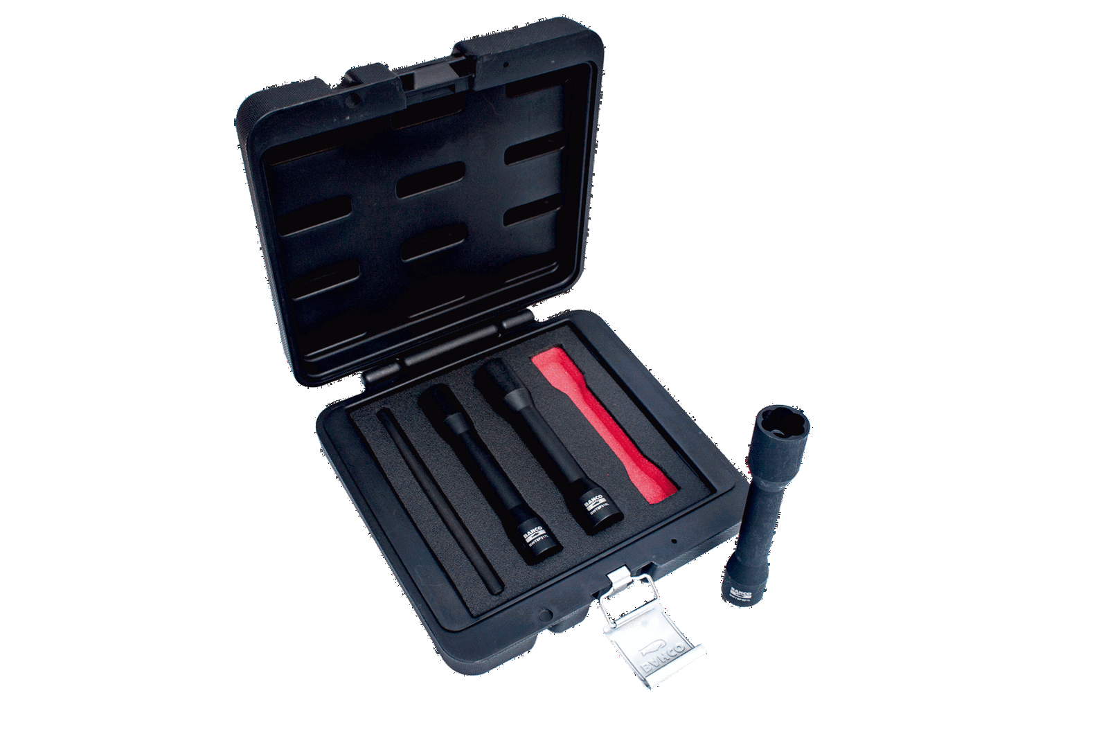 - W zestawie znajdują się 3 długie (150mm) nasadi o rozmiarach 17, 19 i 2 mm i stempla. Nasadki są również dostępne oddzielnie