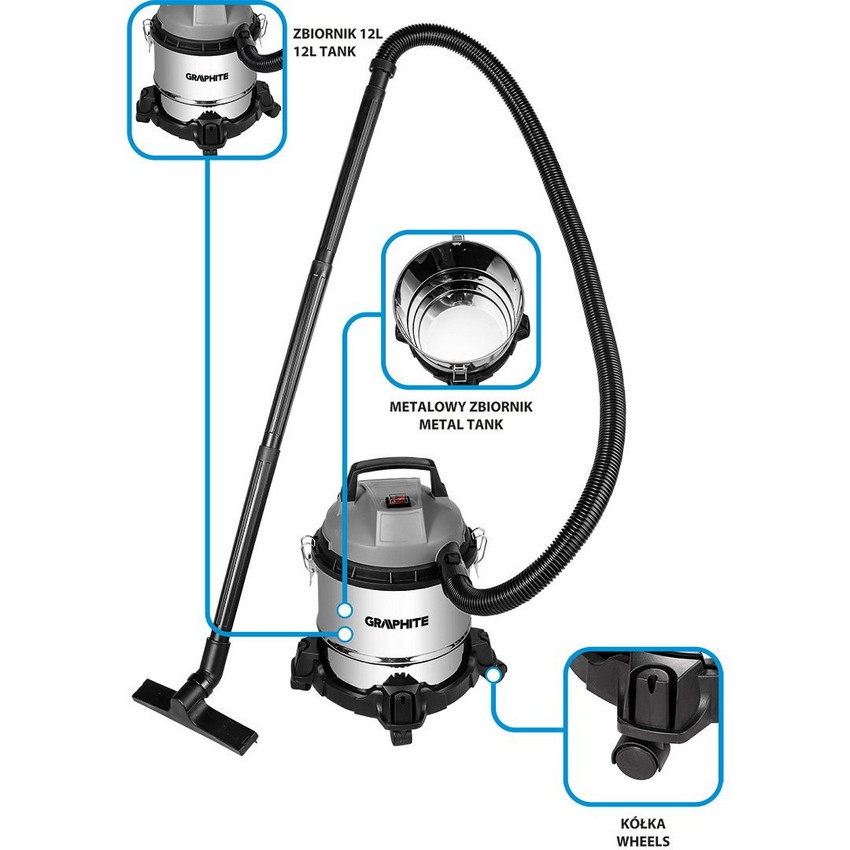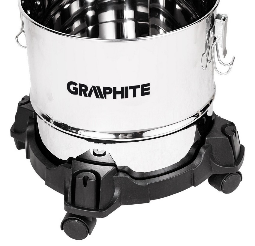 Posiada średnicę węża 32 mm oraz jego długość 2 m. Zbiornik odkurzacza został wykonany z odpornej na korozję stali nierdzewnej. 2-metrowy przewód zasilający oferuje komfort użytkowania. Odkurzacz przemysłowy GRAPHITE posiada filtr tkaninowy oraz piankowy.