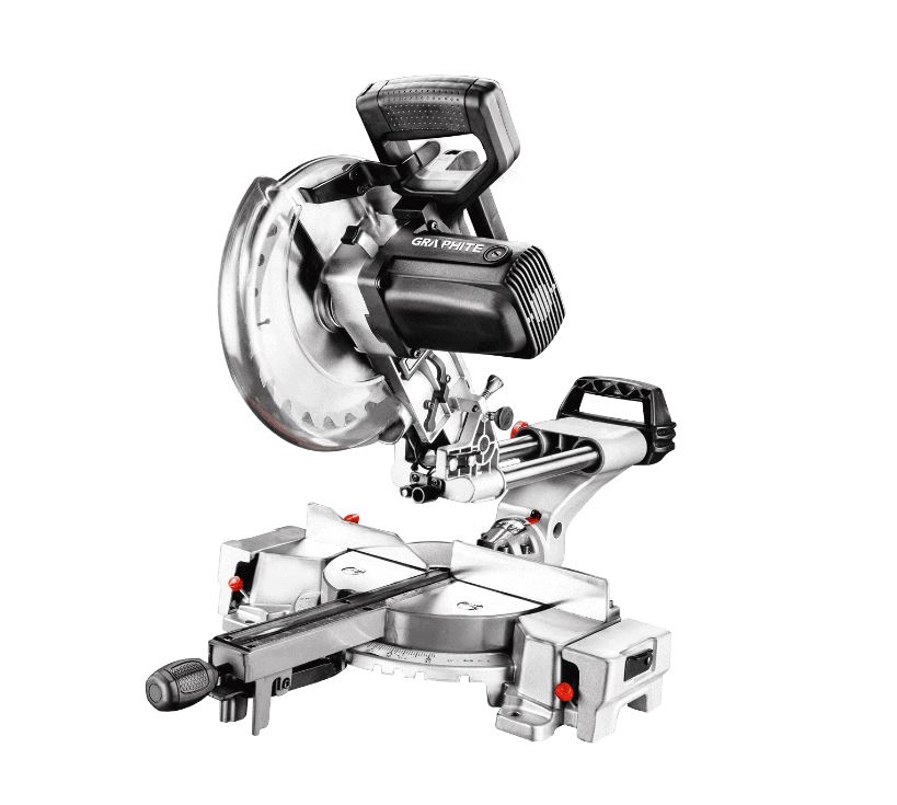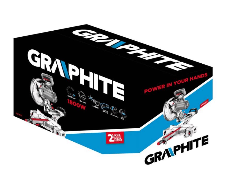 Pilarka ukosowa GRAPHITE z funkcją posuwu głowicy, napędzana silnikiem o mocy 1800W, przeznaczona do precyzyjnego cięcia dużych elementów drewna i materiałów drewnopochodnych.
