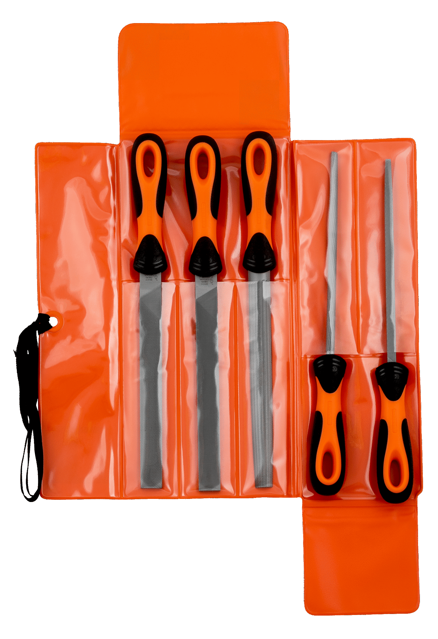 - Zestaw zawiera pilniki warsztatowe: płaski zgrubny, płaski dokładny, kwadratowy zgrubny, półokrągły zgrubny i okrągły zgrubny