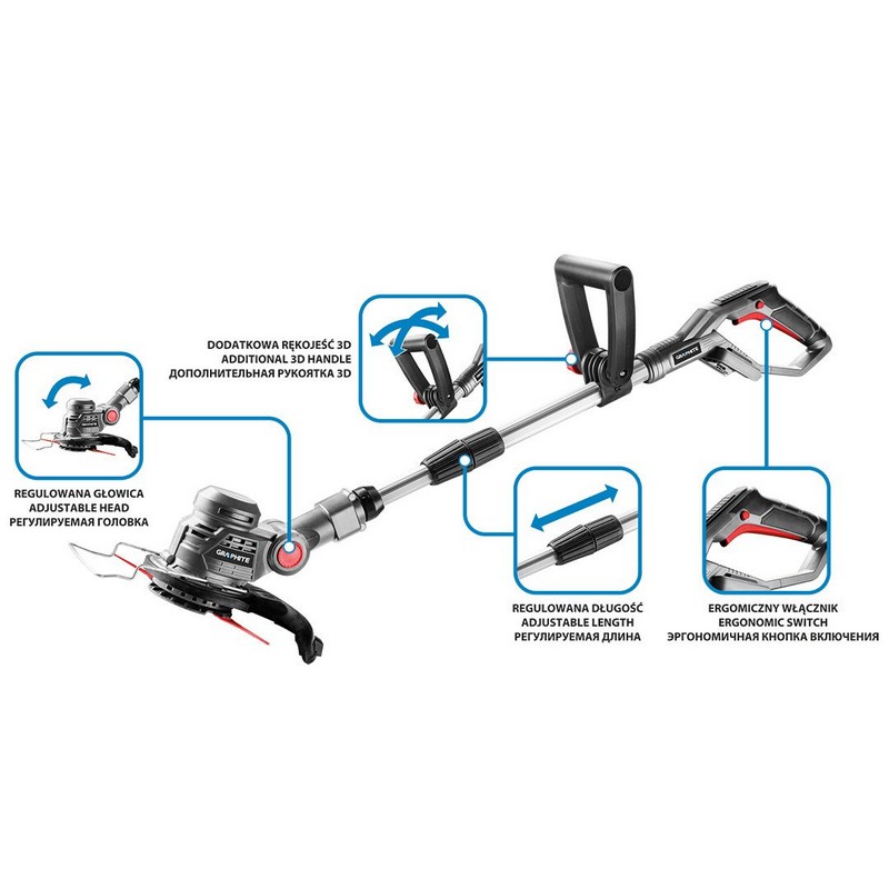 Zestaw E+: podkaszarka (58G030) + akumulator 2ah + ładowarka 58G030-BC marki GRAPHITE to komplet ogrodowej podkaszarki akumulatorowej z akcesoriami, osiągającej obroty 9000 min?1. Urządzenie oferuje możliwość koszenia na szerokości 254 mm. Regulacja długości rękojeści od 1,1 do 1,4 m pozwala lepiej spersonalizować podkaszarkę względem użytkownika, a zestaw polimerowych 22 noży o długości 88,5 mm zapewniają skuteczne cięcie. Dodatkowo, komplet zawiera akumulator o pojemności 2 Ah marki GRAPHITE i ładowarkę o napięciu ładowania 22 V. Czas pełnego ładowania wynosi 1 h, a dzięki wskaźnikowi ładowania oraz elektronicznemu systemowi kontroli temperatury i przepływu prądu jest ona łatwa w użytkowaniu. System Energy+ zapewnia nowoczesne podejście do pracy z urządzeniami elektronicznymi.