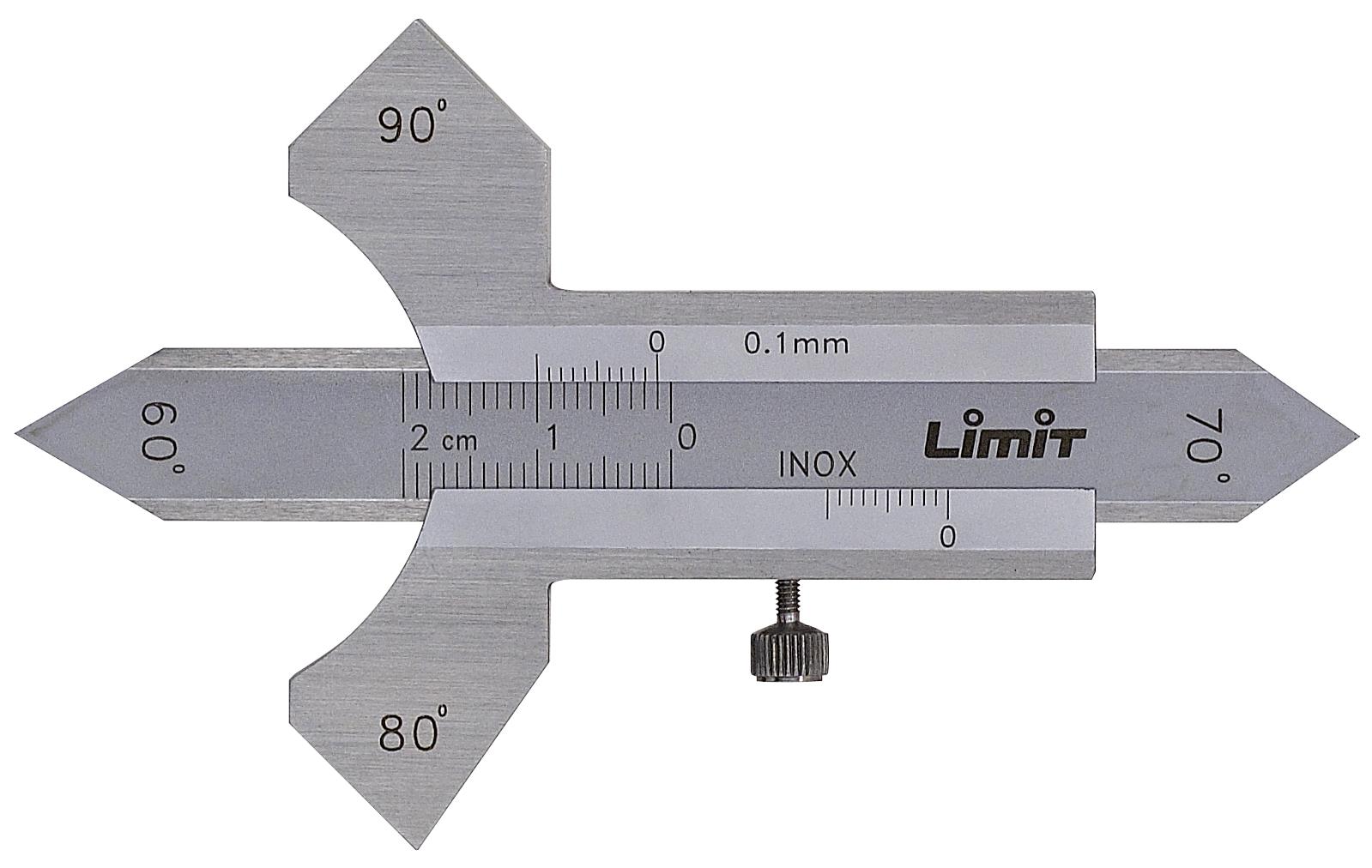 Do pomiaru wysokości spawów płaskich i narożnikowych. Ze stali. Podziałka w mm, z noniuszem 1/10 mm. Wierzchołki o kątach 60°-70°-80°-90°.