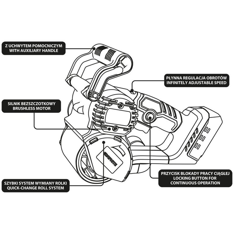Zapewnia prostą obsługę dzięki beznarzędziowej wymianie osprzętu. Jej czas pracy na biegu jałowym zależny jest od zastosowanego akumulatora: 2 Ah – 15 minut użytkowania, 4 Ah – 31 minut lub 6 Ah – 51 minut. Urządzenie można używać do usuwania nalotów, zarysowań, zbędnej warstwy materiału, korygowania wad powierzchni, czyszczenia szczotkami, satynowania czy nadawania powierzchniom struktury. W zależności od zastosowanego wałka istnieje możliwość uzyskania innego efektu obróbki – także tego z wysokim połyskiem. Satyniarka marki GRAPHITE polecana dla profesjonalistów i majsterkowiczów. Oferowana w zestawie z papierem ściernym i wałkiem.