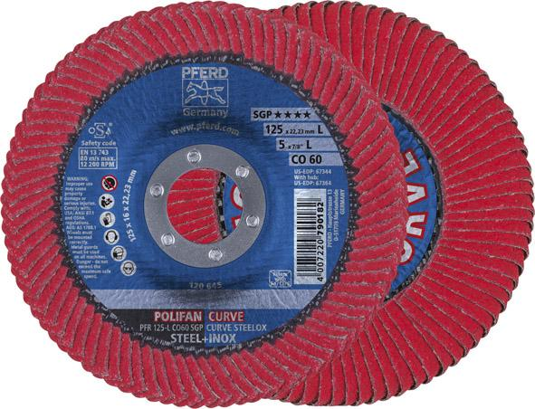 Wykonanie: z ziarnem ceramicznym (CO) i aktywną przy szlifowaniu powłoką chłodzącą, ze spoiwem z żywicy syntetycznej, połączona trwale z talerzem z włókna szklanego. Dzięki temu zwiększa się bardzo wydajność ścierania przy ekstremalnie długiej żywotności. Ściernica listkowa/lamelkowa jest pokryta listkami po stronie szlifowania, jak również po stronie tylnej, a także promieniowo. Bez dodatku wypełniaczy zawierających związki żelaza, chloru i siarki. Otwór znormalizowany 22,23 mm.