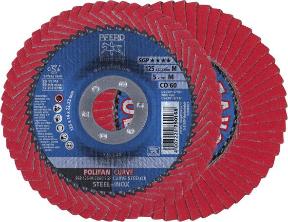 Wykonanie: z ziarnem ceramicznym (CO) i aktywną przy szlifowaniu powłoką chłodzącą, ze spoiwem z żywicy syntetycznej, połączona trwale z talerzem z włókna szklanego. Dzięki temu zwiększa się bardzo wydajność ścierania przy ekstremalnie długiej żywotności. Ściernica listkowa/lamelkowa jest pokryta listkami po stronie szlifowania, jak również po stronie tylnej, a także promieniowo. Bez dodatku wypełniaczy zawierających związki żelaza, chloru i siarki. Otwór znormalizowany 22,23 mm.