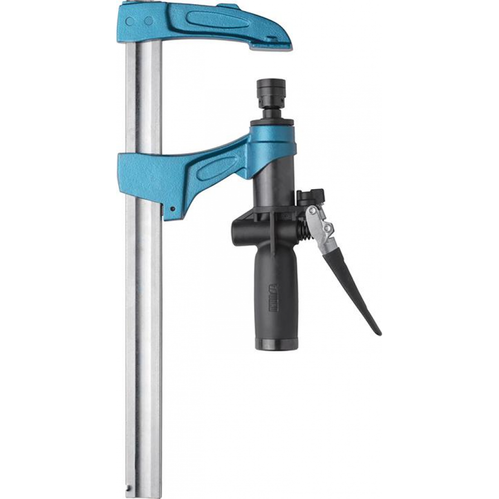 Wykonanie: specjalnie wyprofilowana szyna z hartowanej stali, odporna na skręcanie i ocynkowana, z zabezpieczeniem antypoślizgowym. Ramię stałe i ruchome z bardzo mocnego odlewu, ergonomicznie ukształtowane. Ramię stałe połączono z szyną bez użycia nitów przy wykorzystaniu specjalnej technologii. Wrzeciono z gwintem trapezowym, trwale smarowane i osłonięte dla ochrony przed czynnikami zewnętrznymi jak np. zanieczyszczenia i ciecze. System hydrauliczny obsługiwany jedną ręką zwiększający nawet 10-krotnie siłę ręki. Zastosowanie: do precyzyjnego, kontrolowanego mocowania elementów z drewna i metalu przy niewielkim nakładzie siły. Ścisk można bardzo szybko otworzyć. Do powtarzalnych procesów mocowania w przemyśle i warsztatach. Siła mocowania do 8 kN.