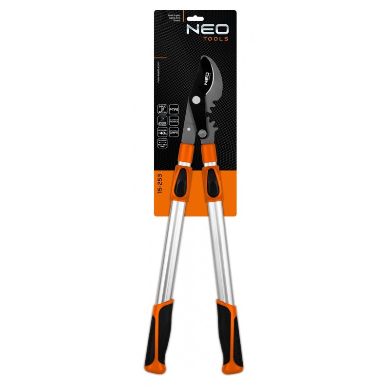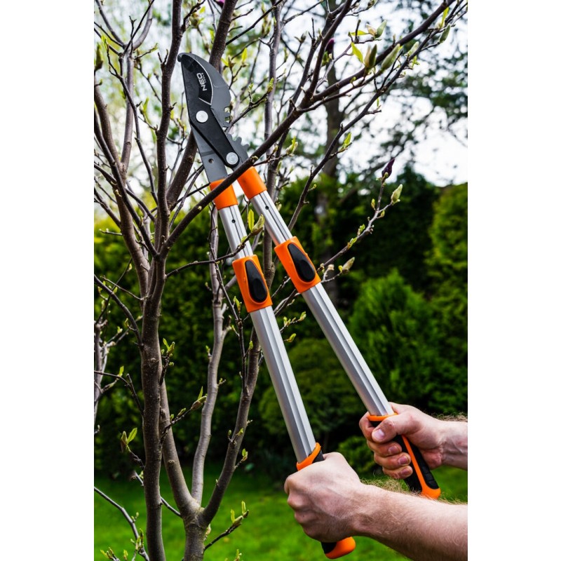Sekator do gałęzi by-pass 665 mm, zakres do 42 mm, przekładnia, teleskopowe uchwyty, 15-253 marki NEO to profesjonalne narzędzie do pracy w ogrodzie z wyżej umiejscowionymi roślinami, bez potrzeby używania drabiny.