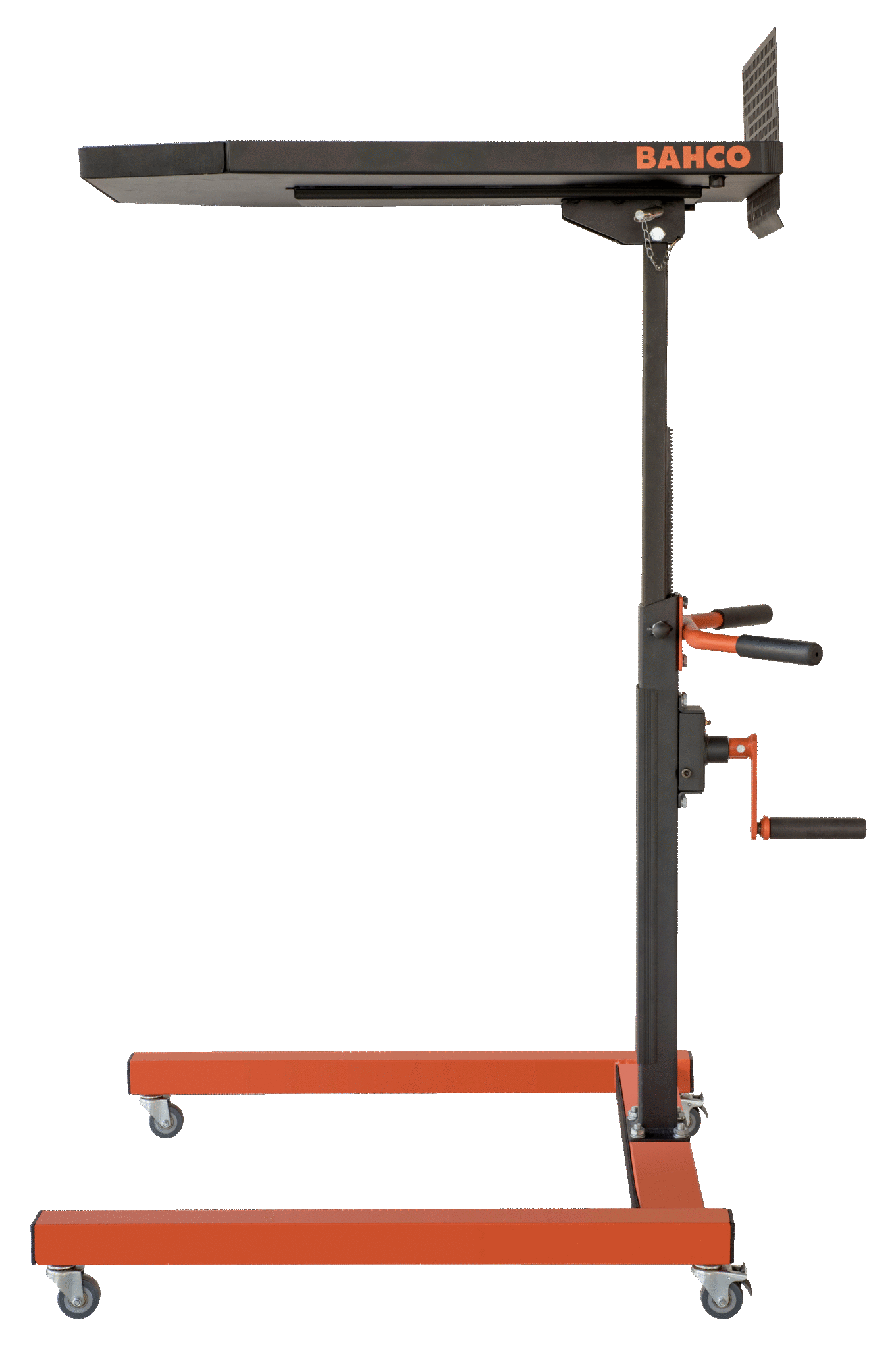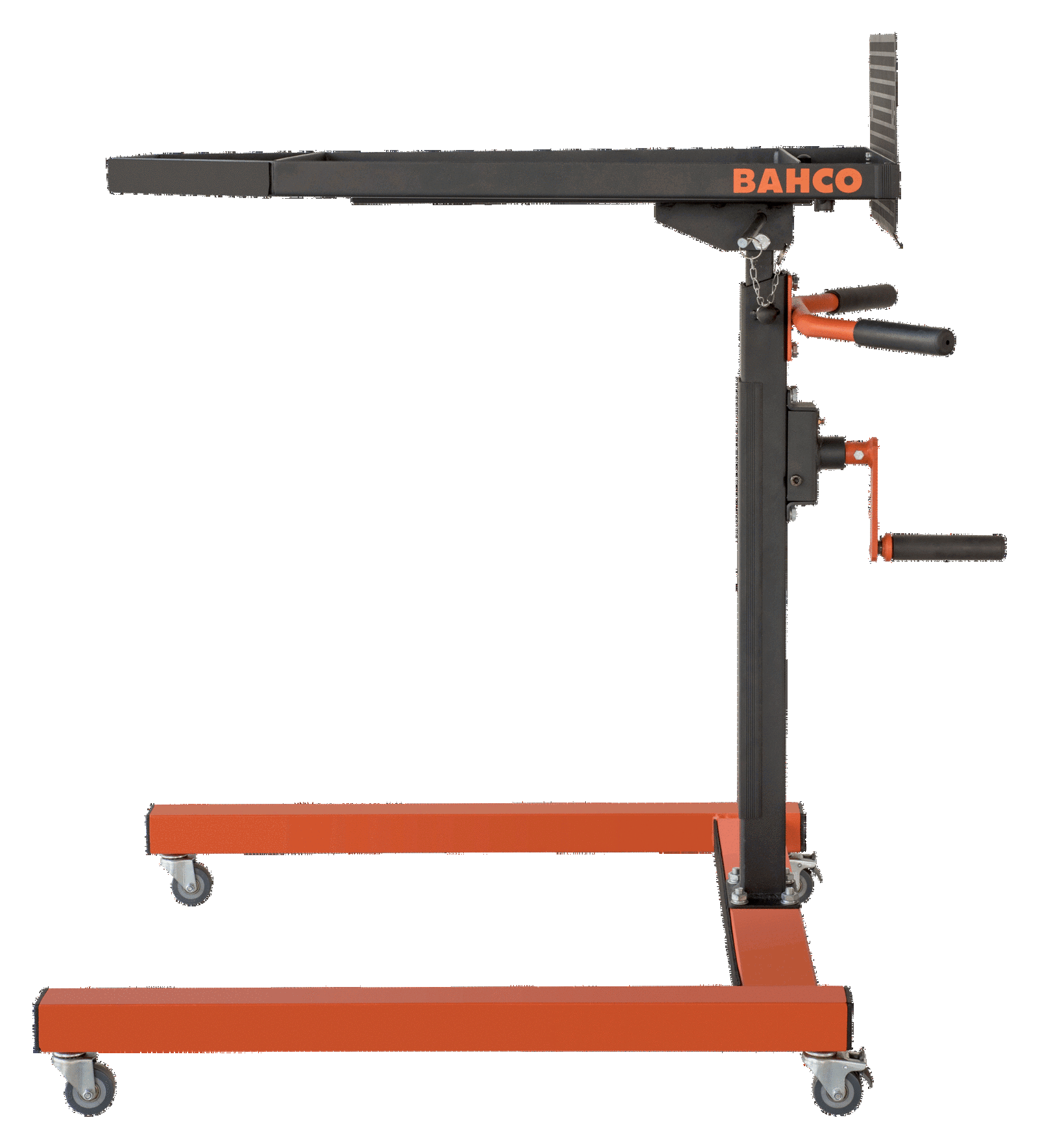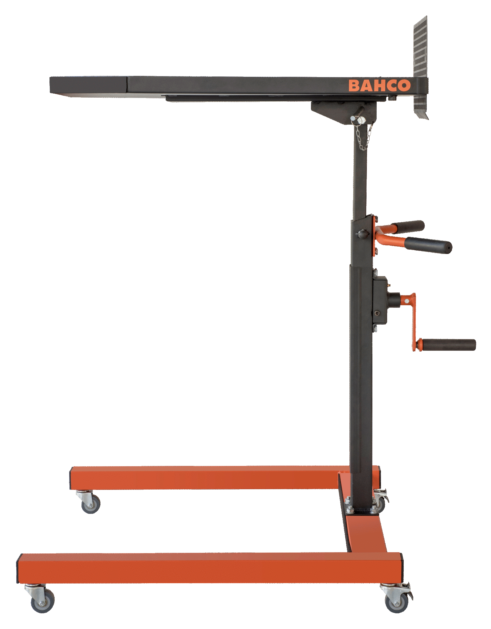 - Mechanizm obrotowy z przekładnią, który umożliwia użytkownikowi końcowemu regulację wysokości stołu bez wysiłku od 950 do 1350 mm, gdy są na nim narzędzia