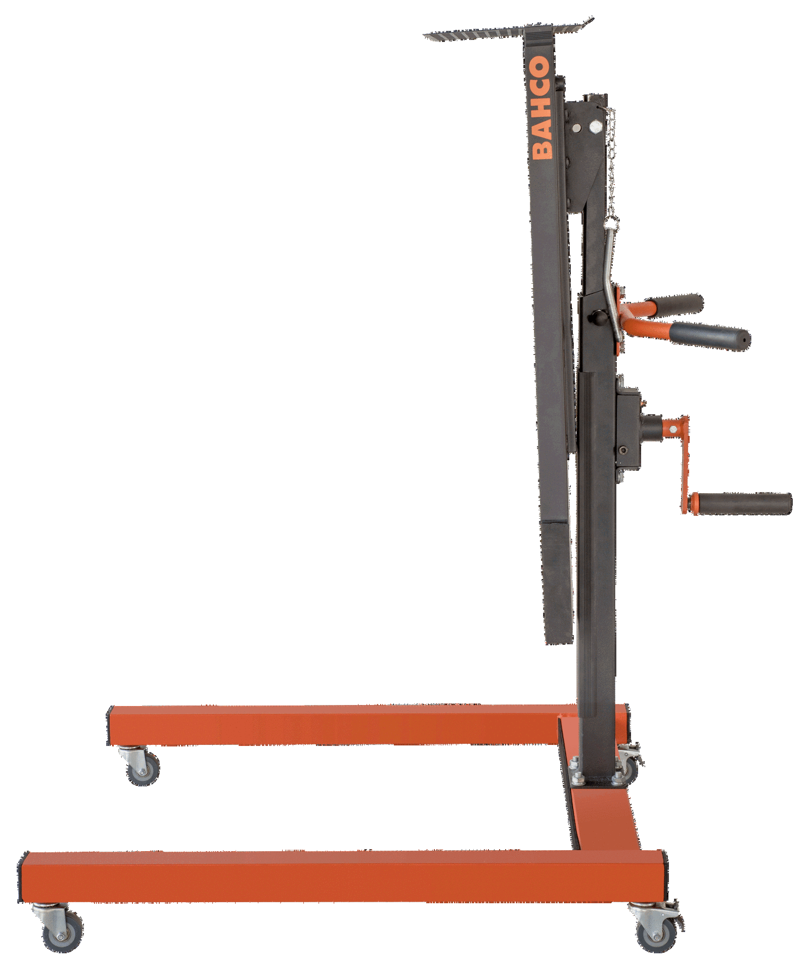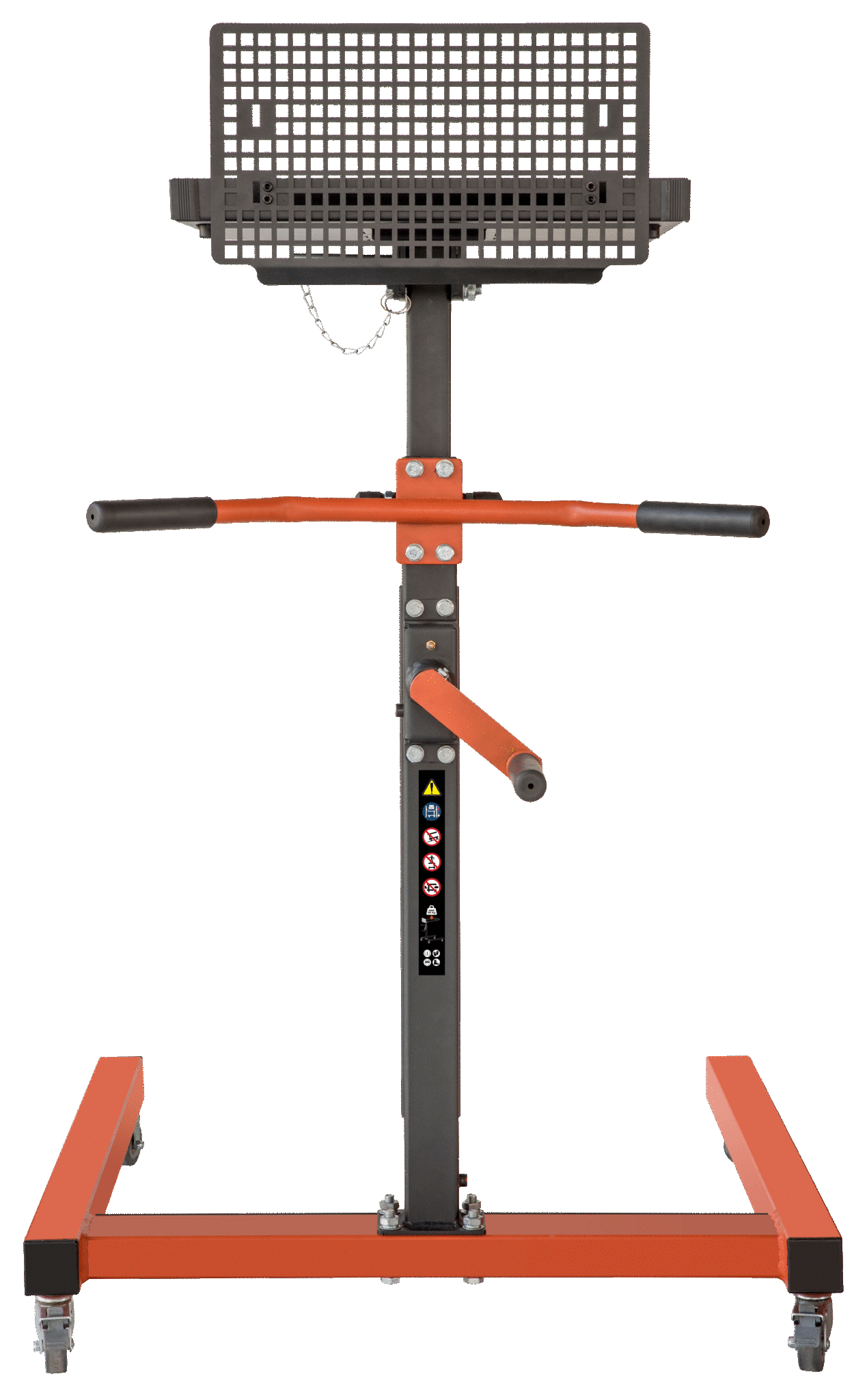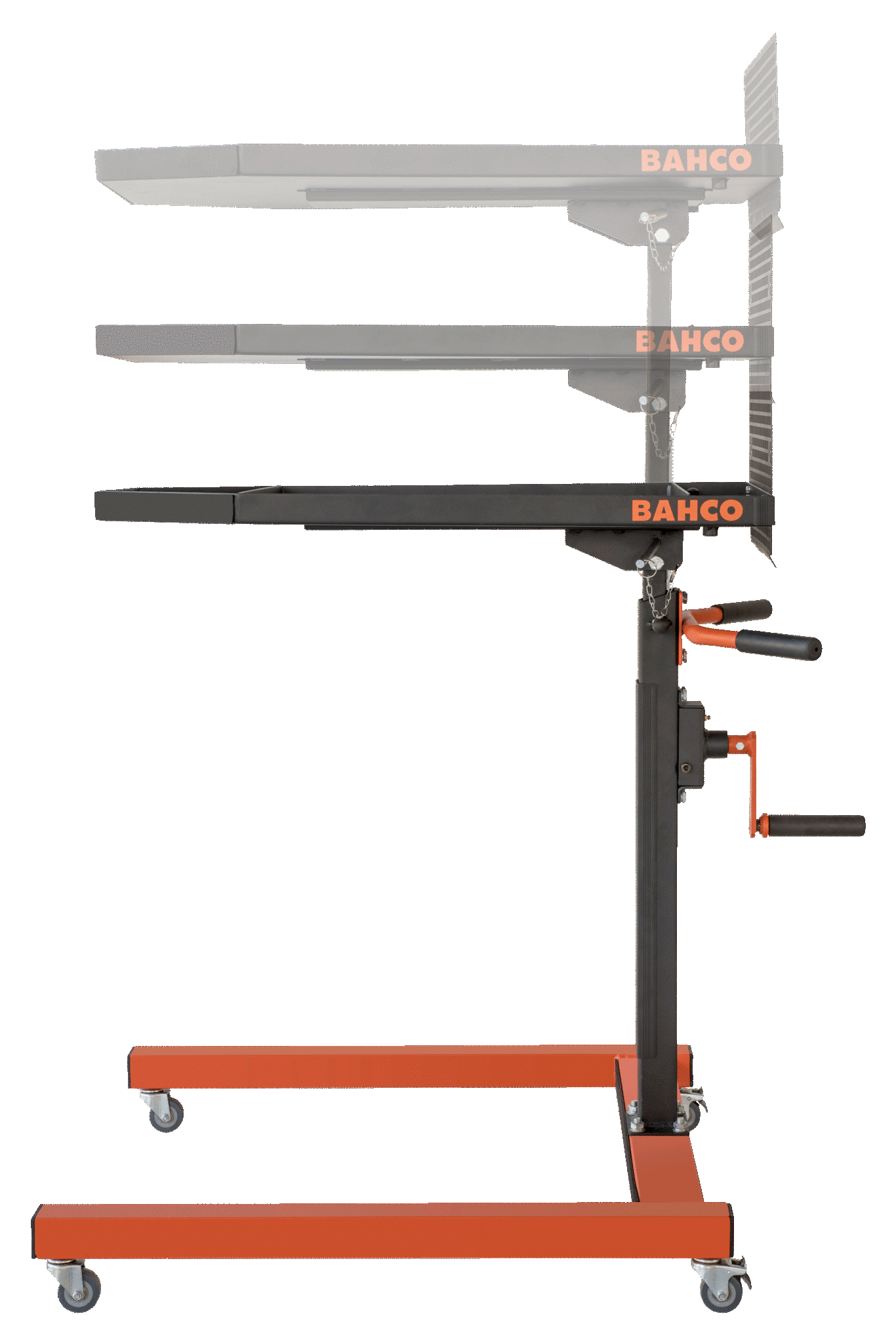 - Mechanizm obrotowy z przekładnią, który umożliwia użytkownikowi końcowemu regulację wysokości stołu bez wysiłku od 950 do 1350 mm, gdy są na nim narzędzia