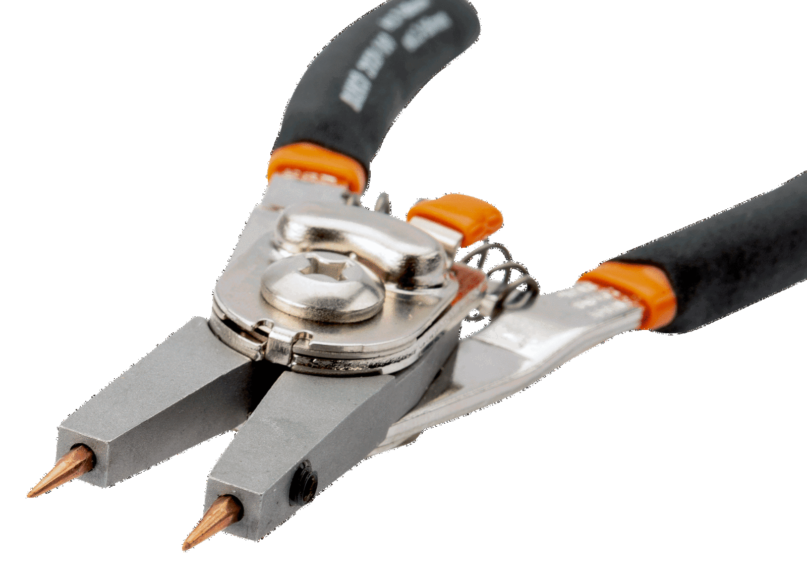 - Opatentowane szczypce wyposażone w wymienne końcówki (odgięte 15° i 90°), które łatwo można używać do pierścieni wewnętrznych lub zewnętrznych