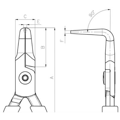 - Szczypce igłowe, zagięte 90º , z zębatymi szczękami