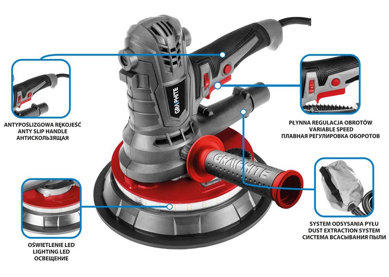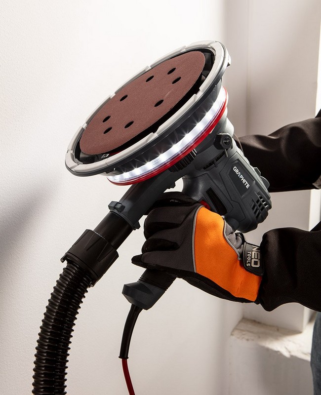 Szlifierka do gipsu 900 W, 180 mm, led 59G263 marki GRAPHITE to szlifierka o mocy 900 W z oświetleniem LED, przeznaczona do obróbki powierzchni gipsowych.