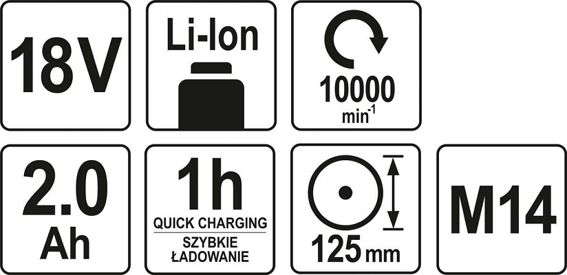 W zestawie: szlifierka, akumulator Li-Ion 18 V 2 Ah, szybka ładowarka (1 h dla baterii 2 Ah).