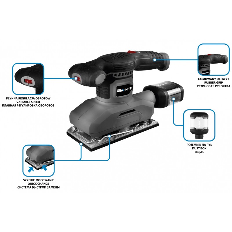 Szlifierka oscylacyjna 260 W, stopa 90 x 187 mm 59G326 marki GRAPHITE to narzędzie o mocy 260 W ze stopą 90 x 187 mm.