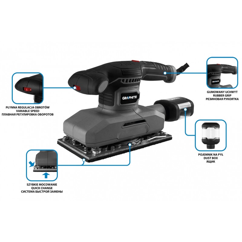 Szlifierka oscylacyjna 380 W, stopa 115 x 230 mm 59G329 marki GRAPHITE to narzędzie o mocy 380 W ze stopą 115 x 230 mm.