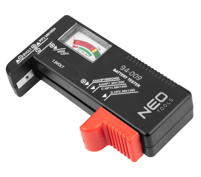 Tester baterii i akumulatorków 94-009 NEO TOOLS to narzędzie dla każdego, kto chce efektywnie zarządzać swoimi zasobami energii. Kompatybilny z ogniwami 1,5 V i 9 V, obsługuje szeroką gamę baterii, w tym AA (R6), AAA (R3), R14, R20, baterie typu pastylki (CR) oraz baterie 9 V (R9). Kompaktowy rozmiar 113 x 64 x 30 mm i niska waga 47 gramów sprawiają, że tester jest łatwy w użyciu oraz przenoszeniu. Zasilanie urządzenia pochodzi bezpośrednio ze sprawdzanej baterii.