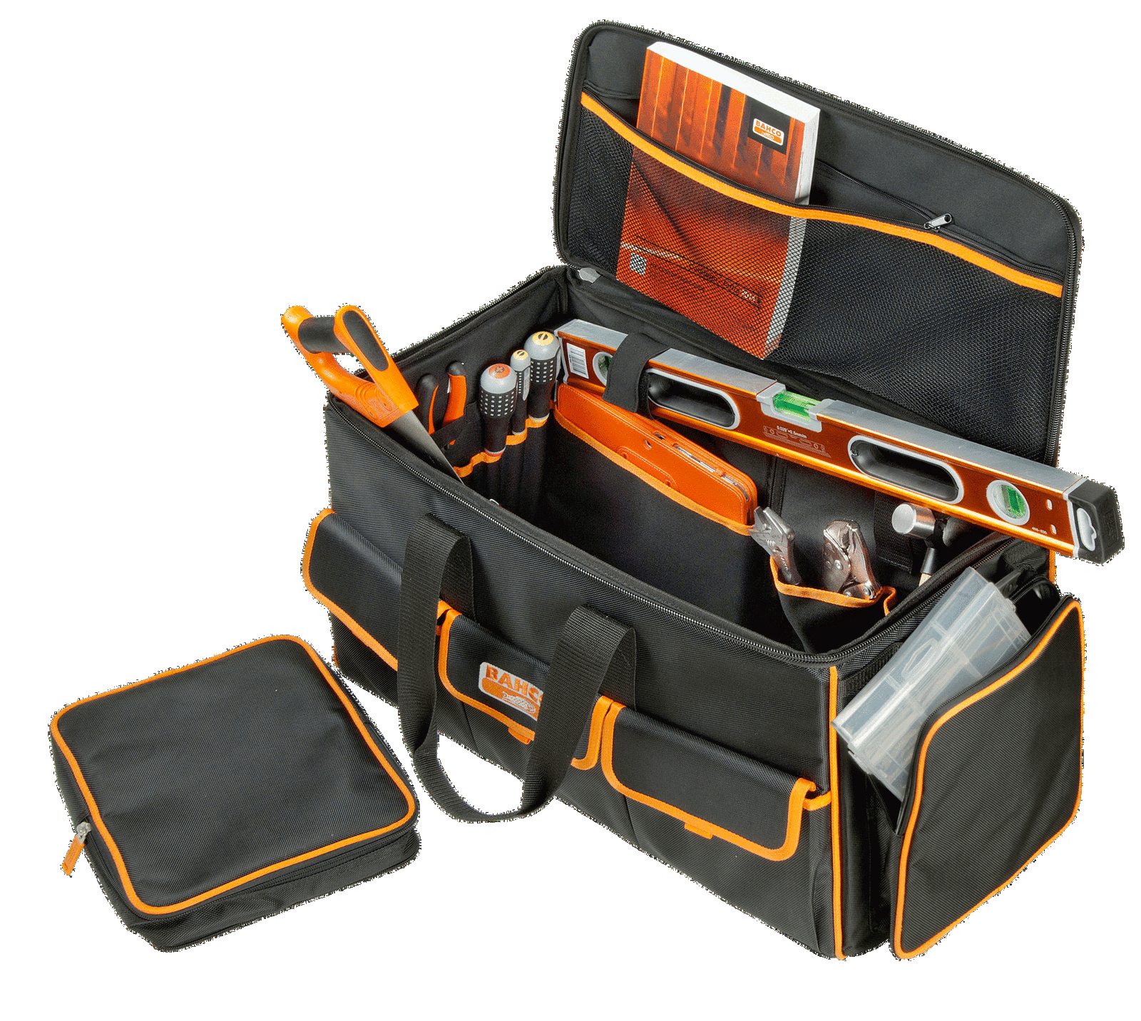 - 2 boczne mini kieszenie; jedna odpinana z plastikowym pudełkiem na śruby, nakrętki i małe elementy