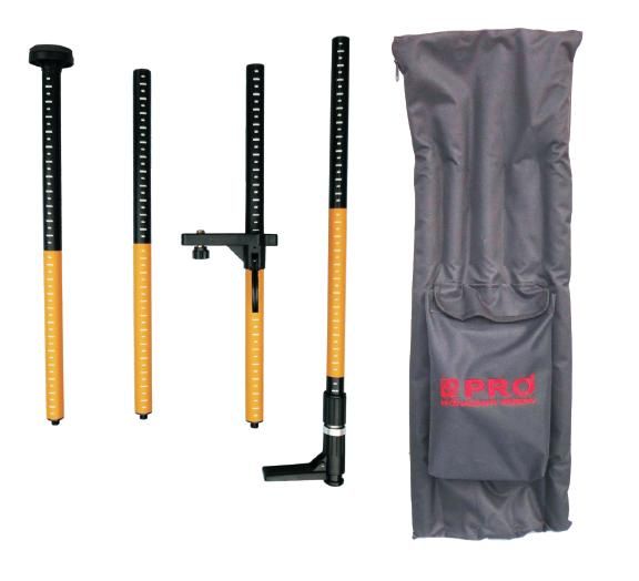 Zestaw: dolny element tyczki o budowie teleskopowej, ze stopką ułatwiającą klinowanie, o górnej końcówce z otworem na śrubę o średnicy 5/8” elementy przedłużające tyczkę, zakończone na obu końcach gwintem umożliwiającym przykręcenie fragmentu do dolnej i górnej części tyczki (60 cm – 3 sztuki, 30 cm – 1 sztuka) ruchomy, uniwersalny uchwyt mocujący z mosiężnymi śrubami o gwintach 5/8” oraz 1/4”, służący do umieszczania lasera na tyczce okrągła podstawka o średnicy 8 cm i wysokości 4 cm, służąca do mocowania tyczki między podłożem a sklepieniem pokrowiec
