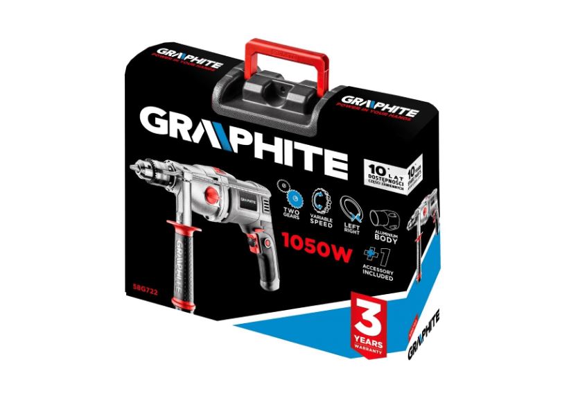 Wysokiej klasy dwubiegowa wiertarka udarowa GRAPHITE napędzana silnikiem o dużej mocy 1050 W, niezawodna przy wierceniu otworów w drewnie, metalu, ceramice, czy tworzywach sztucznych.