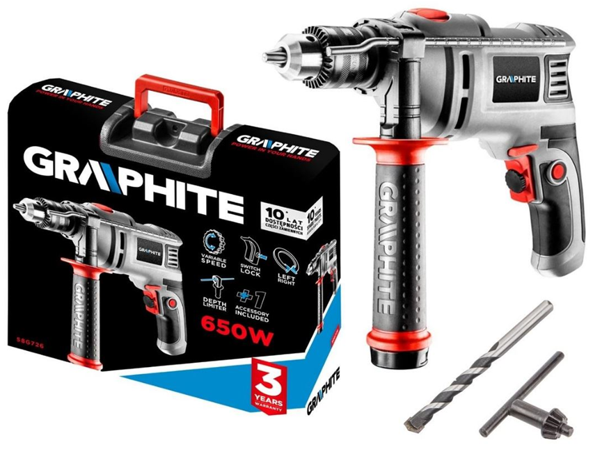 Uniwersalna wiertarka udarowa GRAPHITE o mocy 650 W, doskonale poradzi sobie z materiałami, takimi jak drewno, tworzywa sztuczne, metal czy ceramika.