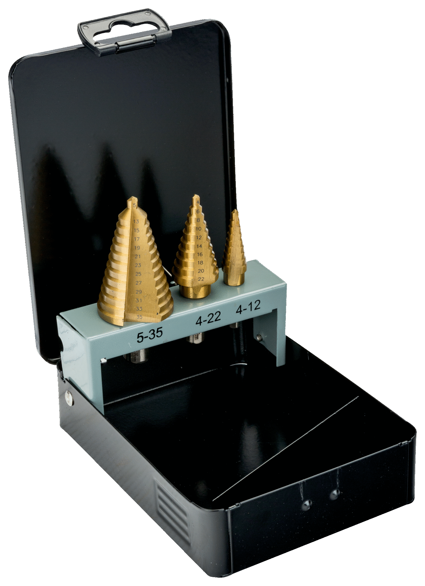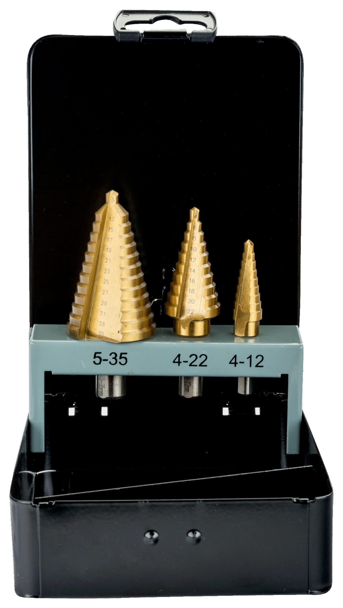 - 3 sztuki wierteł stopniowych ze stali szybkotnącej HSS