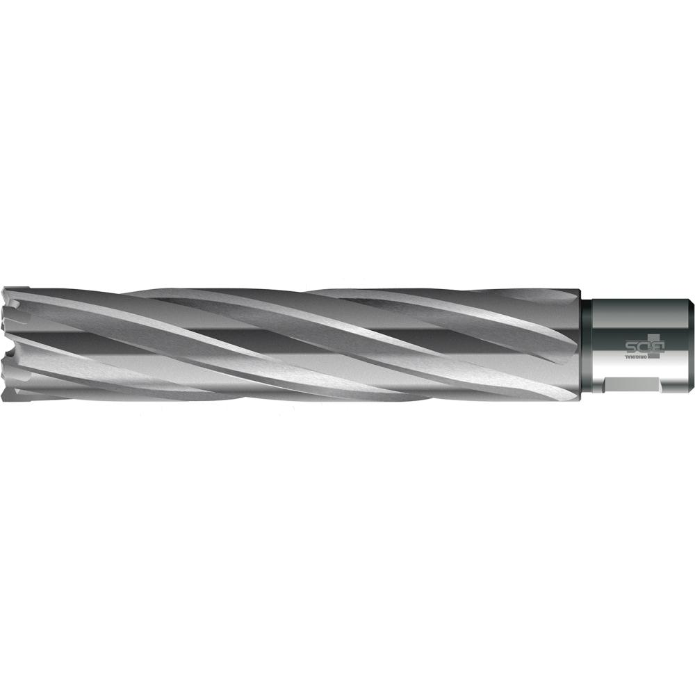 Zastosowanie: do stosowania w wiertarkach magnetycznych lub słupowych z gniazdem ze stożkiem Morse’a. Wiertło rdzeniowe skrawa tylko cienki pierścień materiału. Pozostający rdzeń jest wypychany przez kołek wypychacza za pomocą siły sprężyny. Wióry są odprowadzane szybko na zewnątrz, co minimalizuje niebezpieczeństwo złamania narzędzia. Wykonanie nawet dużych średnic wierconych otworów wymaga stosunkowo niewiele energii. W porównaniu z wiertłem krętym wiertło rdzeniowe skrawa tylko niewielką część całkowitej powierzchni. W efekcie uzyskiwana jest bardzo duża oszczędność energii i czasu.