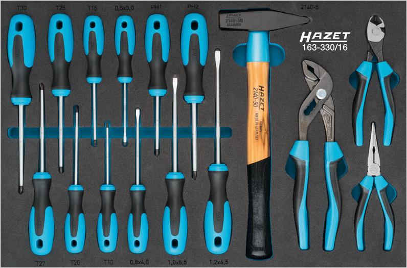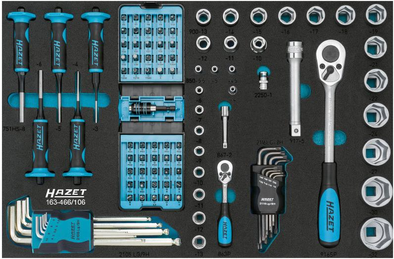 Wykonanie: Stabilna konstrukcja z blachy stalowej, z 7 jednostronnie wysuwanymi szufladami (wysokość 5 x 80; 2 x 165 mm), prowadzonymi na rolkach, z blokadą środkową i końcową oraz z pojedynczą blokadą zapobiegającą przypadkowemu otwarciu podczas jazdy. Podstawowe wyposażenie obejmuje jedną przegródkę blaszaną na każdą szufladę. Ścianki boczne z otworami czworokątnymi. Centralne zamknięcie zamkiem cylindrycznym. Blat roboczy z tworzywa sztucznego odpornego na oddziaływanie rozpuszczalników, ze schowkami na części drobne. Z dużymi, mocnymi kołami na łożyskach kulkowych (Ø 125 mm), z 2 zestawami kołowymi skrętnymi, z hamulcem (Totalstopp), zapewniającymi stabilność we wszystkich kierunkach. Wszystkie koła mają osłony chroniące łożyska przed zabrudzeniami i włóknami. Powierzchnia powlekana proszkowo, odporna na zarysowania, korpus niebieski Hazet, szuflady czarne.