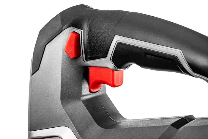 Rękojeść wyposażono w wygodny włącznik z blokadą chroniącą przed przypadkowym uruchomieniem, a miejsce chwytu pokryto antypoślizgowym materiałem dla większego komfortu oraz bezpieczeństwa.