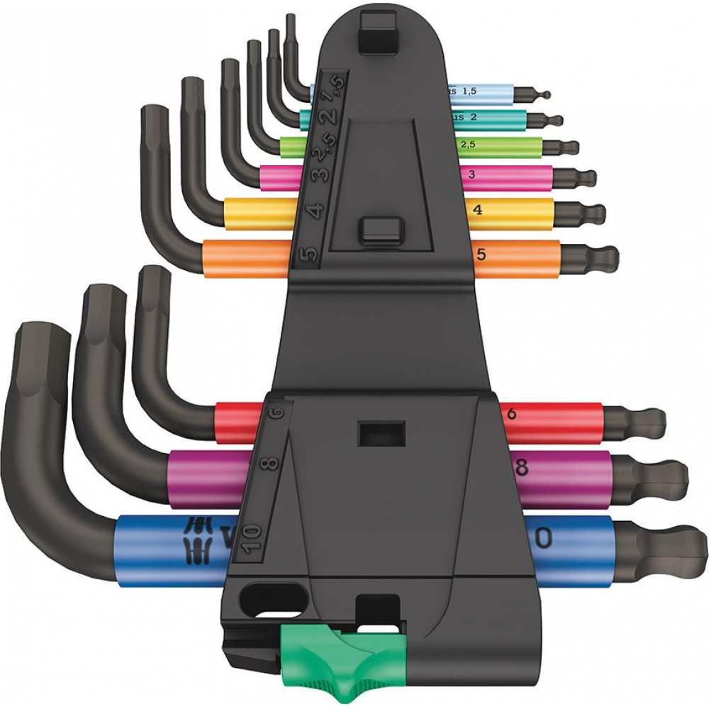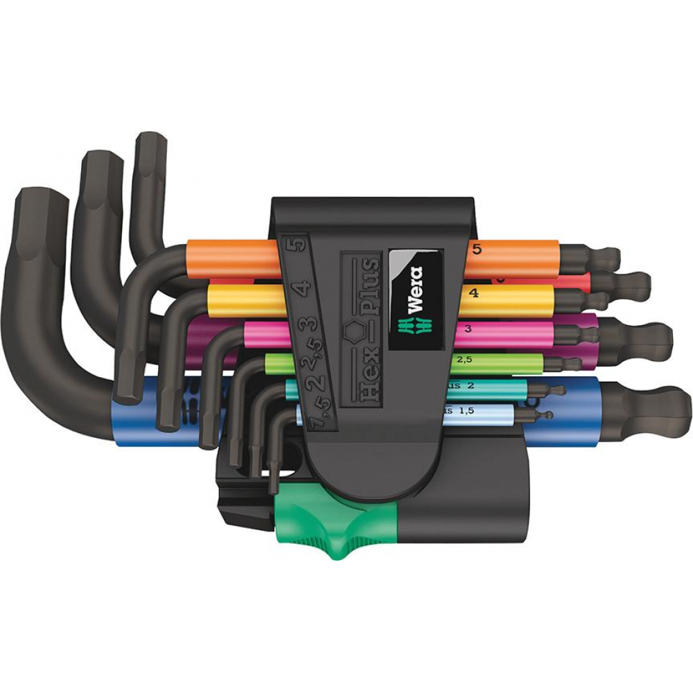 Zest.kluczy trzpien.kąt. w uchwycie, 9-cz., 1,5-10mm,lakierow. z kulistą końców.Wera