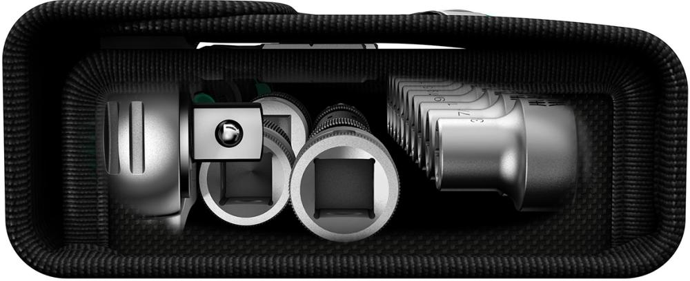 Wykonanie: Narzędzia ze stali chromowo-wanadowej. Grzechotka metalowa ze stali chromowo-molibdenowej, odkuwana. Bardzo wąska, z długą dźwignią dla zapewnienia dobrego dojścia w miejscach ciasnych i do przenoszenia dużych momentów obrotowych, ustalacz kulkowy zapewnia pewne osadzenie nasadki. Mały ciężar dla zwiększenia mobilności, duża wytrzymałość. Dostawa w kompaktowym etui tekstylnym, które chroni wrażliwe powierzchnie.