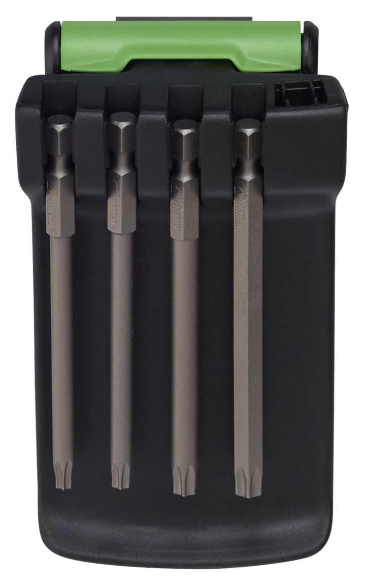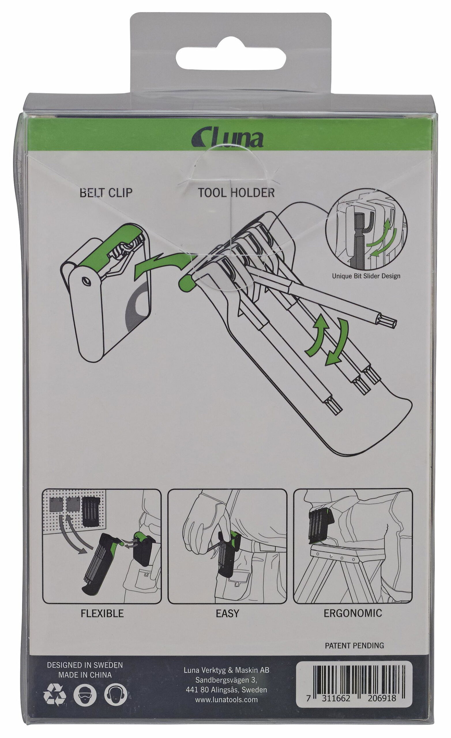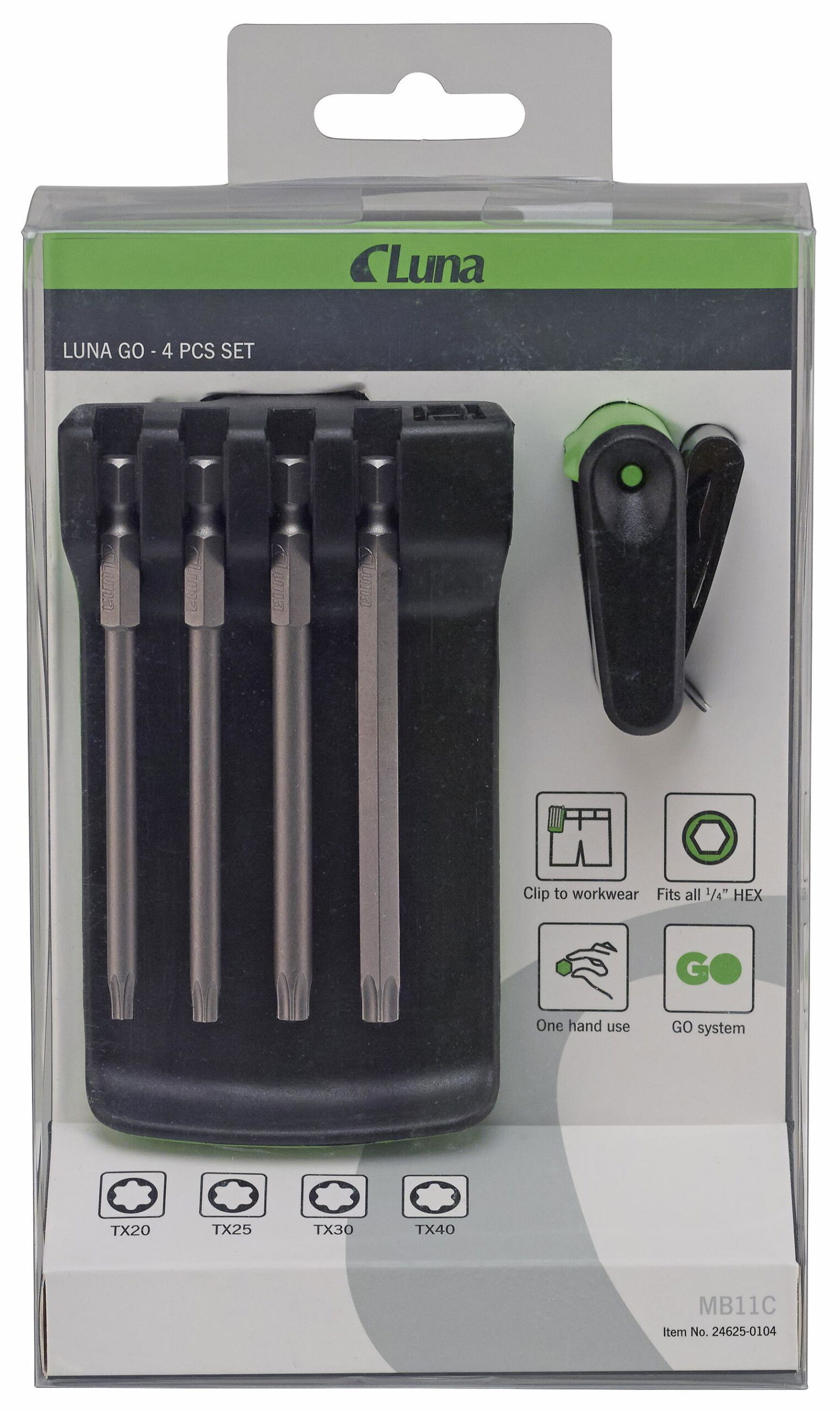 4-elementowy zestaw grotów w uchwycie narzędziowym systemu Luna GO z zaczepem na pas. Oryginalny uchwyt narzędziowy z zabezpieczeniem magnetycznym, z miejscem na jedno narzędzie wkładane od góry i cztery zawieszane. Do szybkiego i wygodnego użytkowania i przechowywania narzędzi z chwytem sześciokątnym 1/4″. Uchwyt narzędziowy może być łatwo zaczepiony przegubowo na pas, zapewniając wygodę pracy i bezpieczeństwo użytkowania.