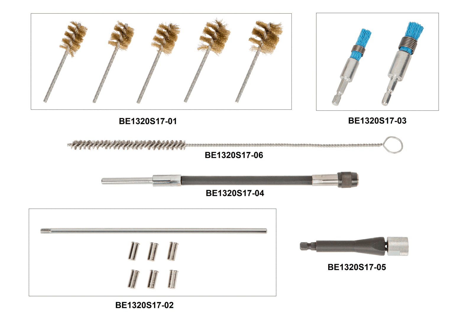 - Pięć szczotek z drutem stalowym powlekanych mosiądzem o średnicy Ø18, Ø19, Ø21, Ø24 oraz Ø26mm