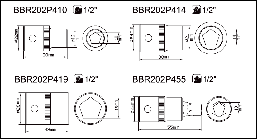 - BBR202P410 / Pentagon 1/2” Socket, 10 mm