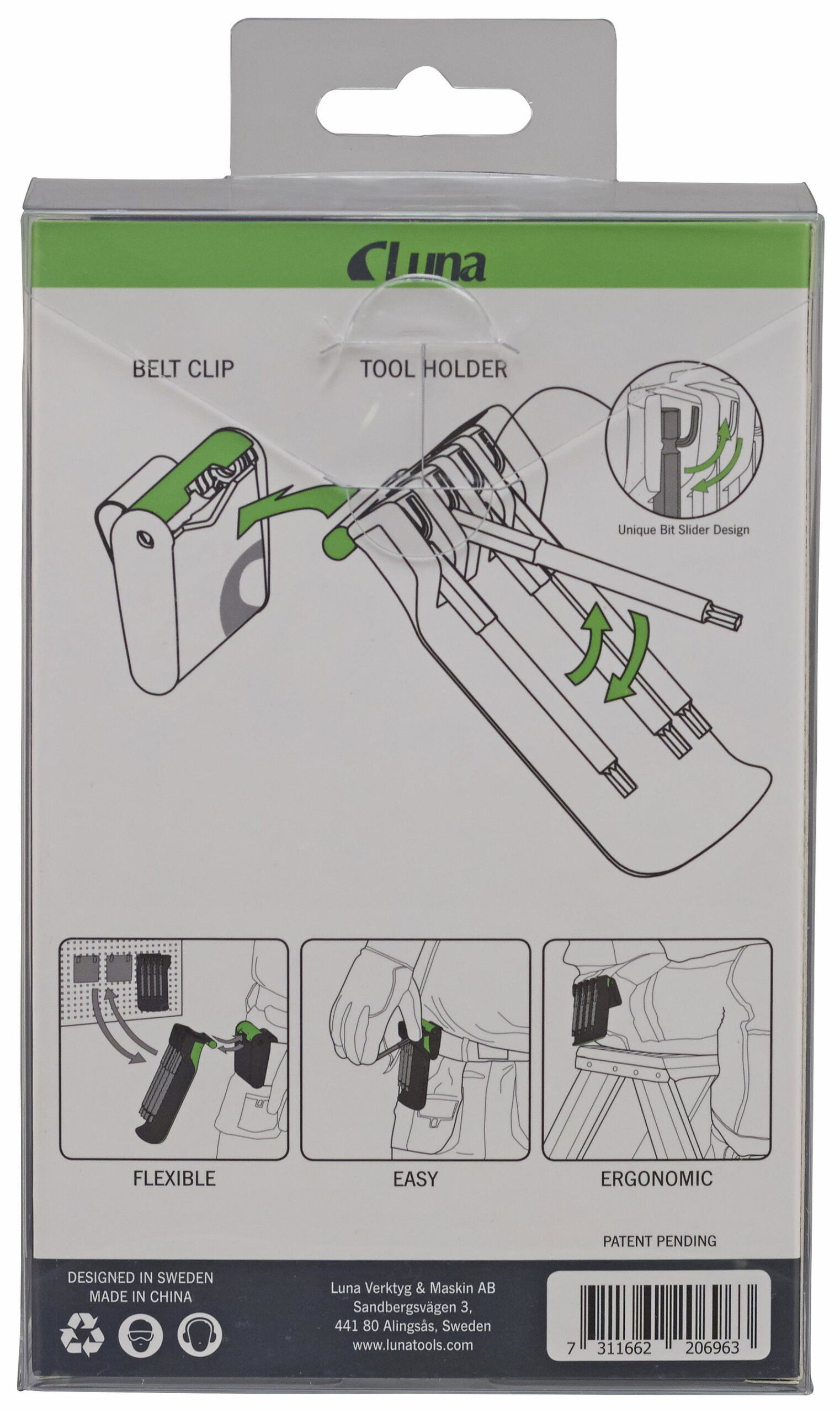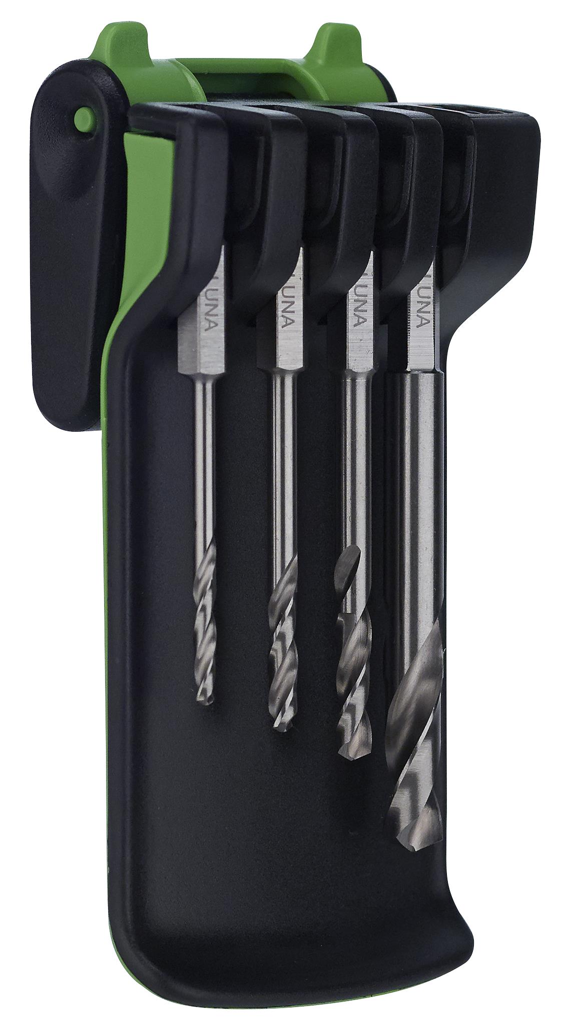 4-elementowy zestaw wierteł HSS w uchwycie narzędziowym systemu Luna GO z zaczepem na pas. Oryginalny uchwyt narzędziowy z zabezpieczeniem magnetycznym, z miejscem na jedno narzędzie wkładane od góry i cztery zawieszane. Do szybkiego i wygodnego użytkowania i przechowywanie narzędzi z chwytem sześciokątnym 1/4″. Uchwyt narzędziowy ma budowę przegubową i jest łatwo zaczepiany na pas, zapewniając wygodę pracy i bezpieczeństwo użytkowania. Można używać wraz z wkrętarką udarową.